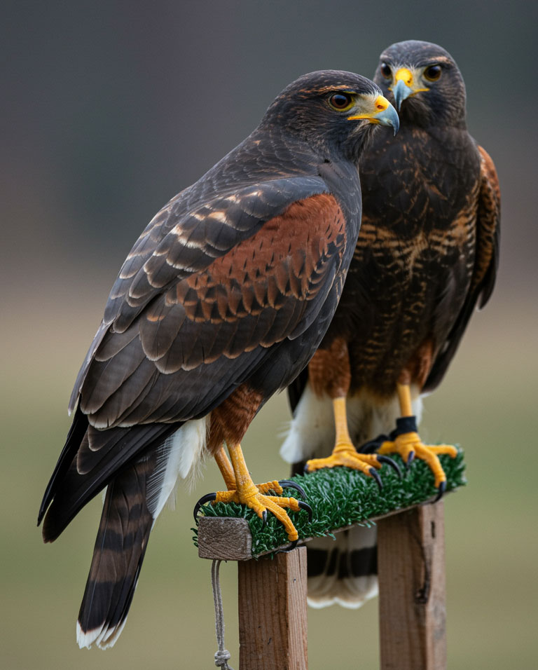 Le Poiane di Harris (L’Intelligenza Tattica): Originarie del continente americano, sono uniche per la loro natura sociale. Vivono in famiglie gerarchiche e questo le rende capaci di collaborare in gruppo (“cast”) e comunicare in volo per massimizzare il risultato.